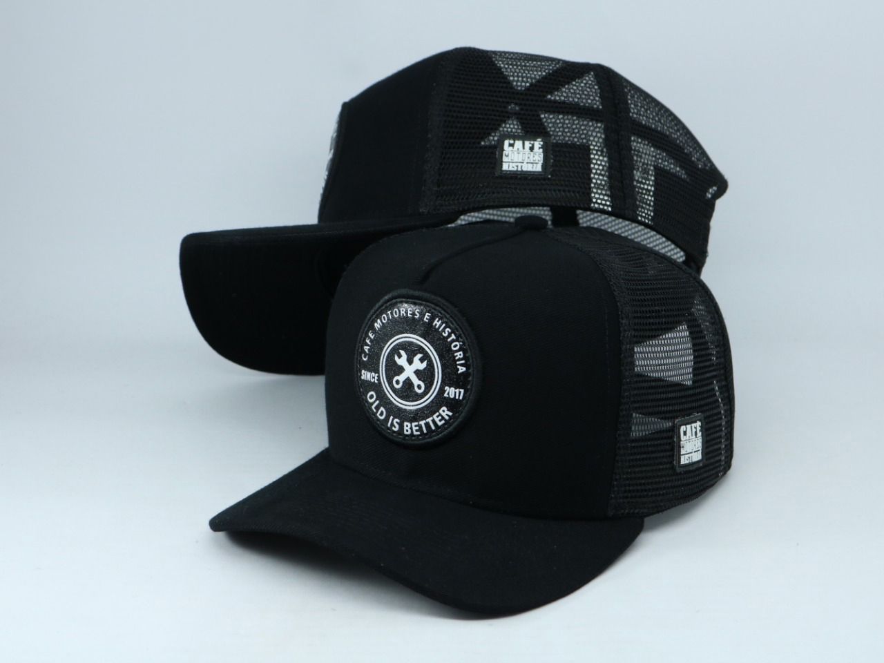 O Boné Trucker Old is Better foi desenvolvido para os amantes de carros antigos, do antigomobilismo. Ele é feito em tecido preto. Patch frontal emborrachado, com bordado e silk de alto relevo e patch lateral também em silk.